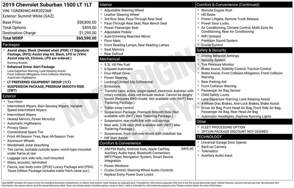 Summit White 2019 Chevrolet 4D Sport Utility Suburban LT EcoTec3 5.3L V8 Flex Fuel 4WD